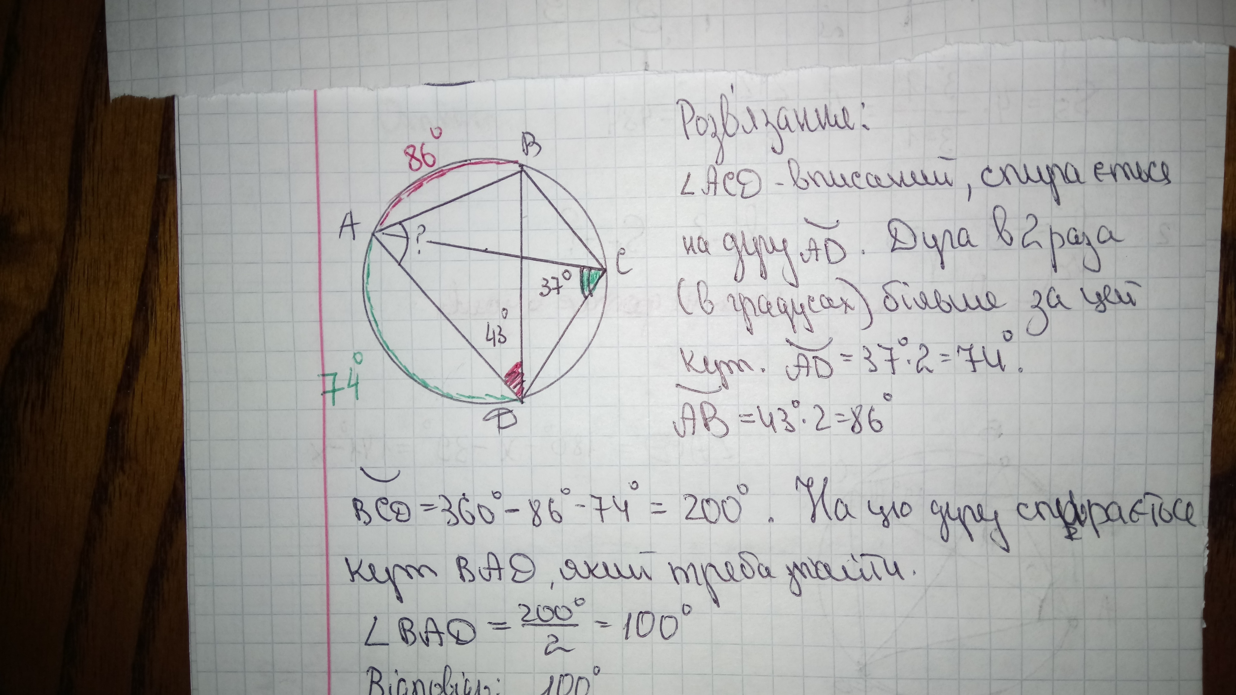 Чому дорівнює кут BAD чотирикутника ABCD вписаного в коло, якщо кут ACD=37 градусів, а кут ADB=43 градусів.
