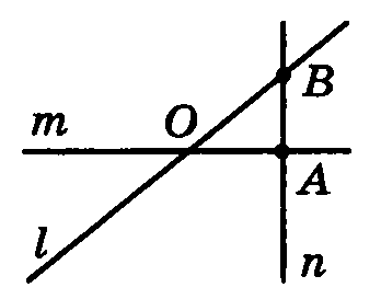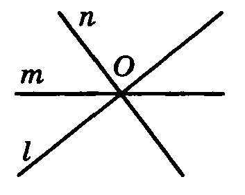 Проведем две прямые (пересечённо) l и m, обозначив буквой О точку пересечения этих прямых. Третью прямую n можно провести двумя способами.