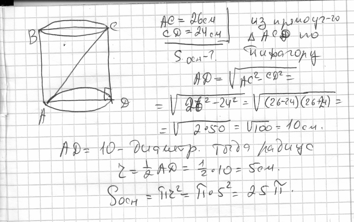 Диагональ осевого сечения цилиндра 26 см., высота цилиндра равна 24см. Найдите площадь основания цилиндра.