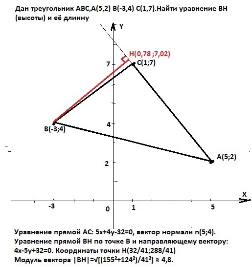 Дан треугольник ABC, A(5;2), B(-3;4), C(1;7). Найти уравнение BH(высоты) и её длину.Решение.Уравнение прямой АС по двум точкам:(X-Xa)/(Xc-Xa)=(Y-Ya)/Yc-Ya) или (X-5)/(-4)=(Y-2)/5 =>5X+4Y-32=0 (1) - уравнение прямой АС в общем виде с коэффициентами А=5, В=4, С=0 и D=-32.Вектор нормали (перпендикуляра) к этой прямой n(A;B) или n(5;4).Этот же вектор является направляющим вектором прямой ВН.Уравнение прямой ВН по точке В(-3;4) и направляющему вектору р(5;4):py(X-Xb)=px(Y-Yb) или 4(Х-(-3)=5(Y-4) =>4x-5y+32=0 (2) - это искомое уравнение прямой ВН.Длина вектора модуль) ВН=√[(Xh-Xb)²+(Yh-Yb)²].Координаты точки Н Xh и Yh находим, решая систему двух уравнений (1) и (2).5x+4y=32 |*4 25x+20y=1604x-5y+32 |*5 => 16x-20y=128, отсюдах=32/41, y=(32-5х)/4=288/41.Тогда |BH|=√[(155²+124²)/41²]≈156,8/41≈4,8.