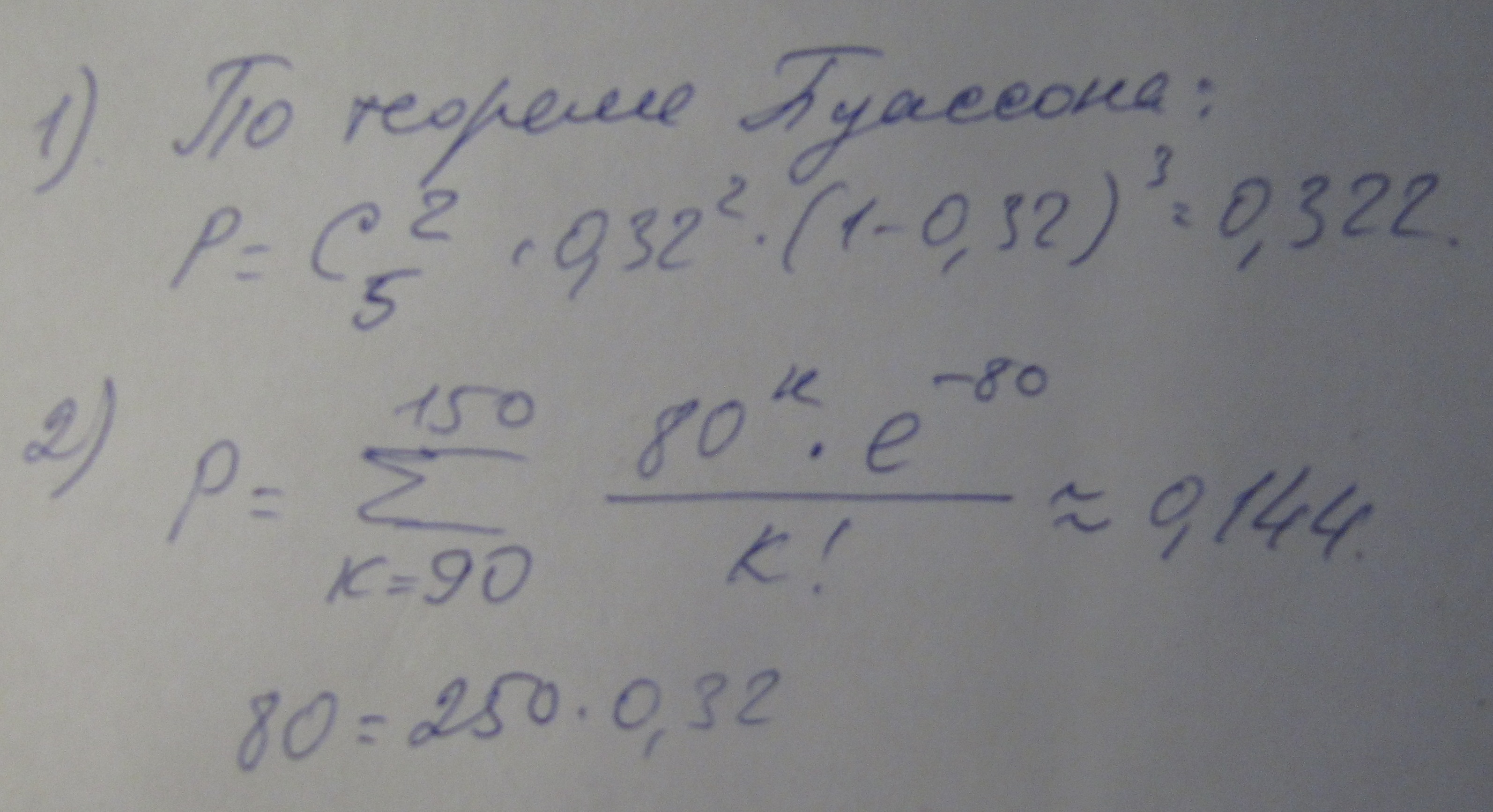 Вероятность появления события А в одном испытании равна 0,32. Вычислить вероятности следующих событий: а) событие А наступит 2 раза в серии из 5 независимых испытаний; б) событие А наступит не менее 90 и не более 150 раз в серии из 250 независимых испытаний.