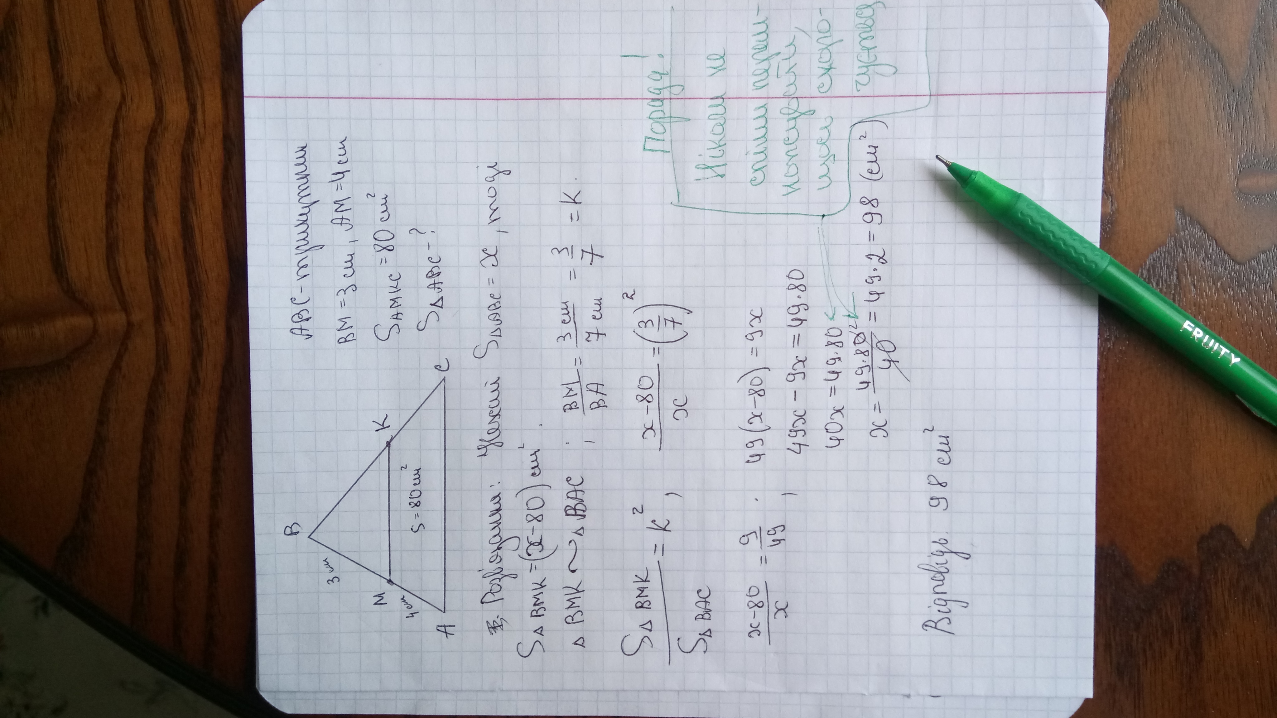 пряма, паралельна стороні АС трикутника АВС, перетинає його сторону АВ у точці М, a сторону ВС - у точці К. Знайдіть площу трикутника АВС, якщо ВМ=3см, АМ=4см, а площа чотирикутника АМКС дорівнює 80см^2