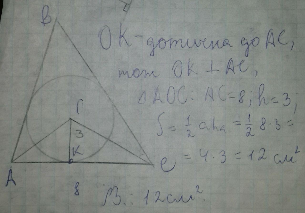 У трикутнику ABC вписано коло з центром у точці О, яке дотикається до сторони AC=8cм у точці К, ОК=3см. Знайдіть площу трикутника АОС.