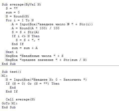 Sub test()M1: N = InputBox("Введите N; 0 - Закончить ") If (N = 0) Or (N = "") Then End End If Call average(N)GoTo M1:End Sub
