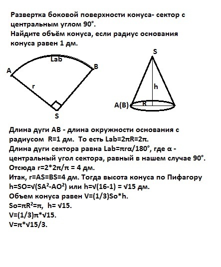 Длина дуги АВ - длина окружности основания с радиусом R=1 дм. То есть Lab=2πR=2π.Длина дуги сектора равна Lab=πrα/180°, где α - центральный угол сектора, равный в нашем случае 90°. Отсюда r=2*2π/π = 4 дм. Итак, r=AS=BS=4 дм. Тогда высота конуса по Пифагоруh=SO=√(SA²-AO²) или h=√(16-1) = √15 дм.Объем конуса равен V=(1/3)So*h.So=πR²=π дм², h= √15 дм.V=(1/3)π*√15 дм³.V=π*√15/3 дм³.