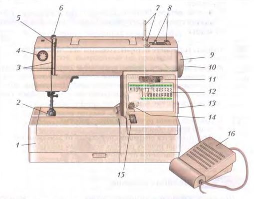 Назови основные узлы швейной машины с электрическим приводом, которая изображена на картинке.