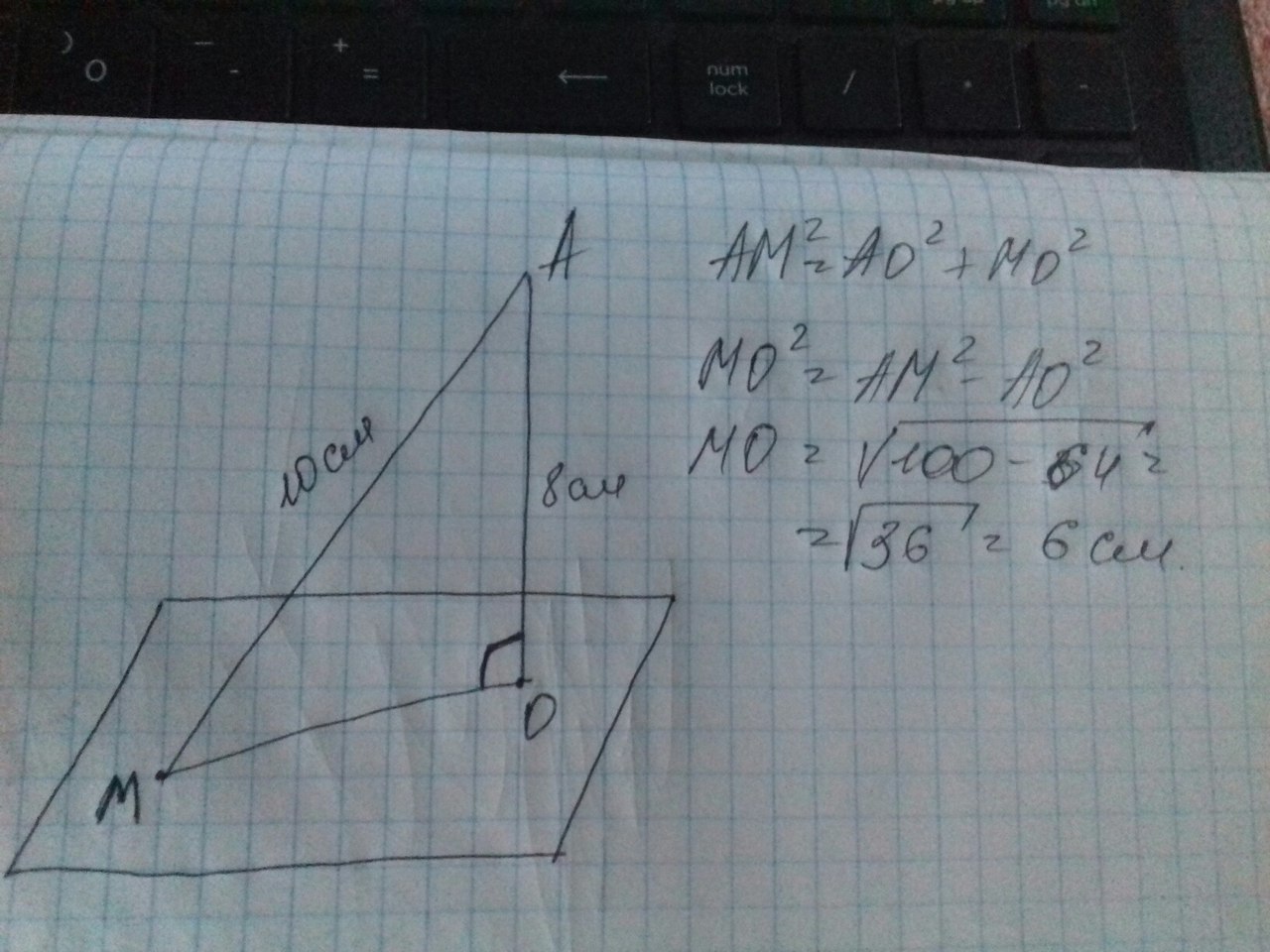 Точка А находится от плоскости на расстоянии 8 см и из неё проведена наклонная , равная 10 см. Найдите проекцию этой наклонной