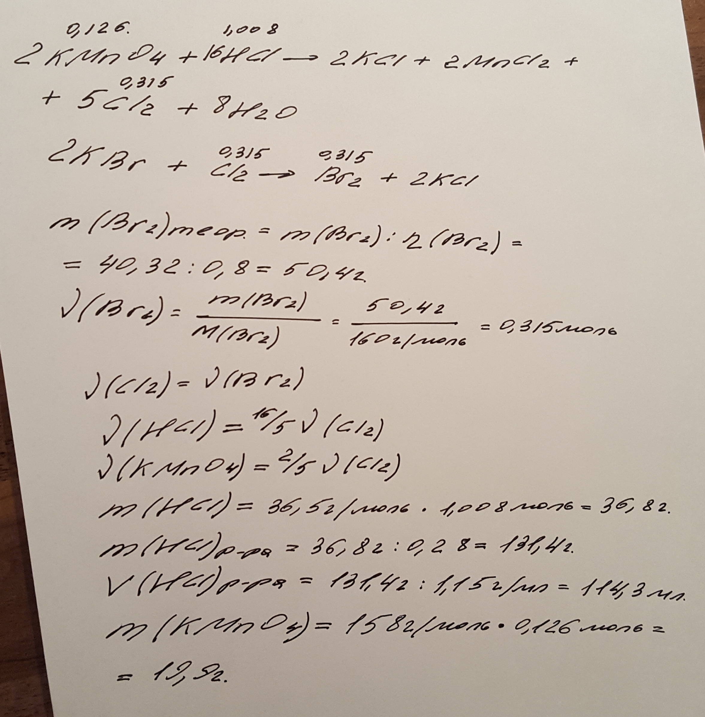 6.	Какую массу перманганата калия и какой объем раствора с массовой долей соляной кислоты 28% (пл. 1,15 г/мл) необходимо взять для полу-чения такого количества хлора, которое может вытеснить из раствора бромида калия бром массой 40,32 г, если выход брома 80%?