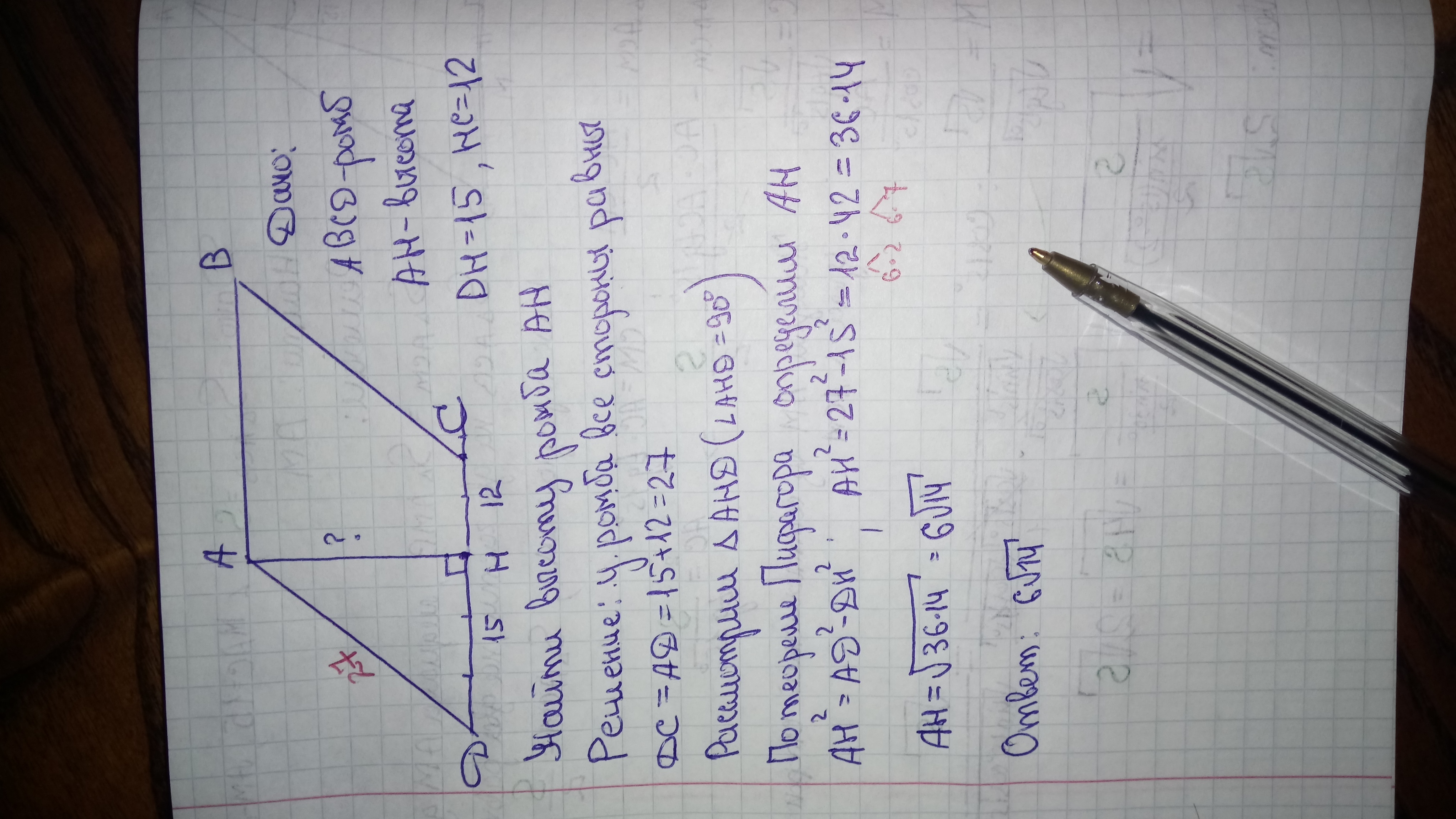 сторона ромба 15+12=27.