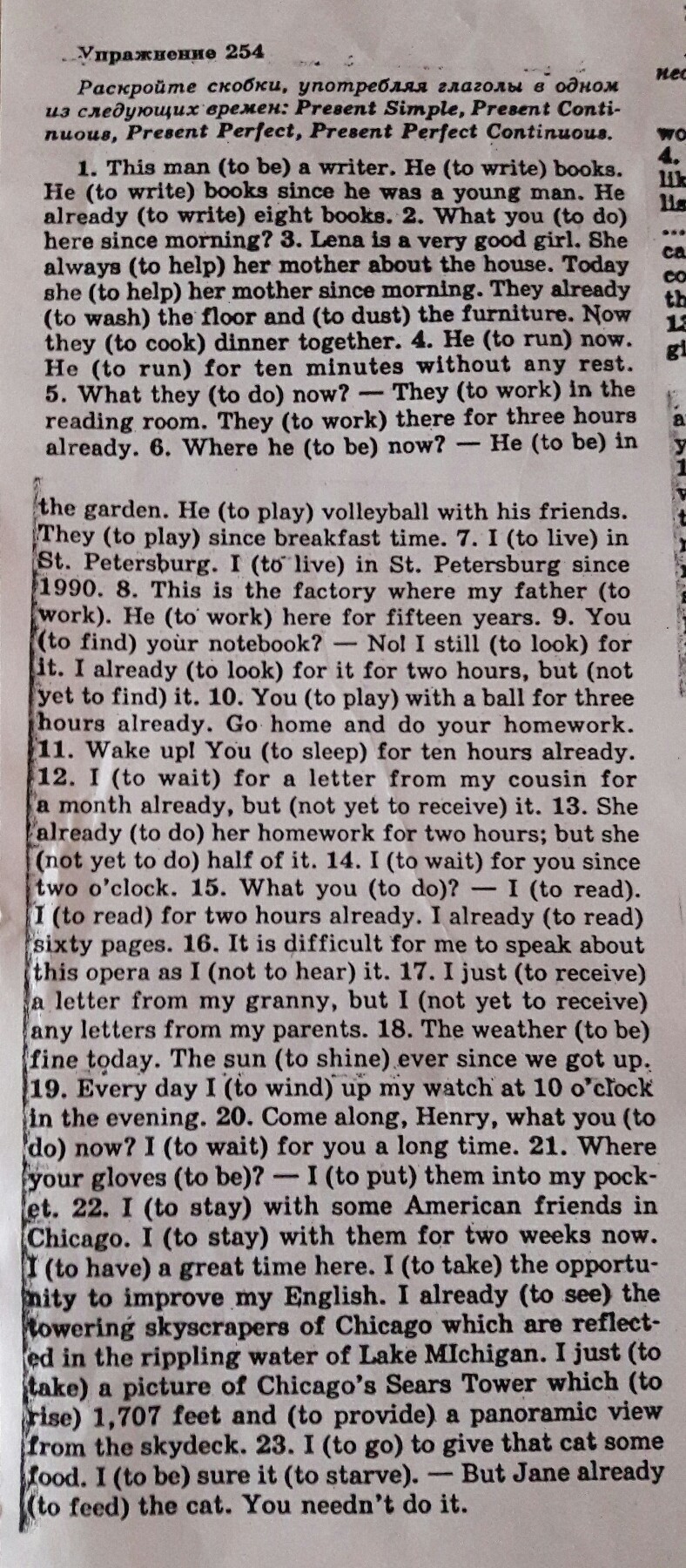 22 I am staying with some American friends in Chicago. I have been staying with them for two weeks now. I am having a great time here. I am talking the opportunity to improve my English. I have already seen the towering skyscrapers of Chicago which are reflected in the ripping water of Lake Michigan. I have just taken a picture of Chicago 's Sears Tower which rises 1, 707 feet and provides a panoramic view from the sky desk.