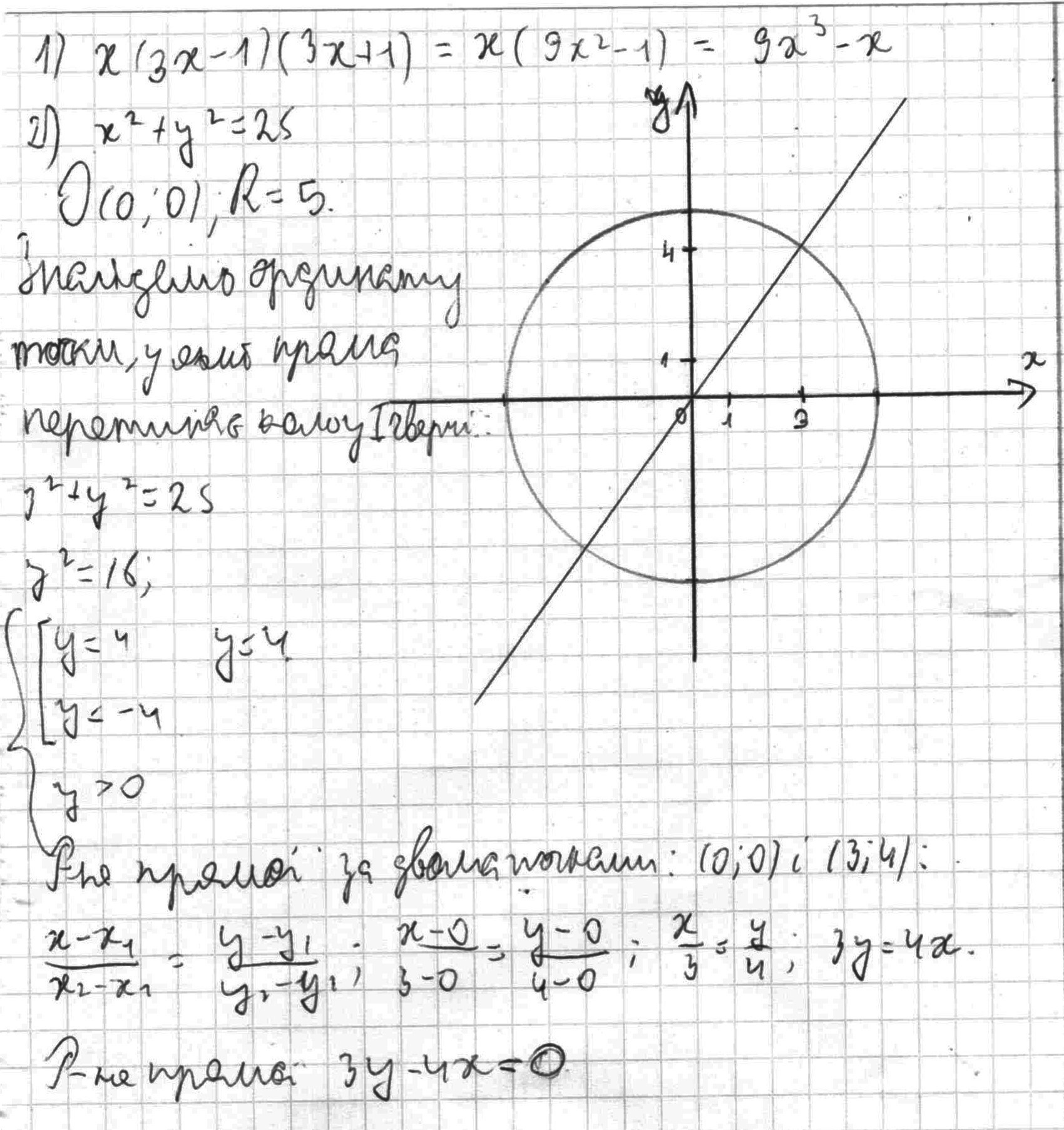 2) Пряма, яка проходить через початок координат, перетинає коло x^2+y^2=25 у точці з абсцисою 3 і додатною ординатою. Запишіть рівняння цієї прямої.