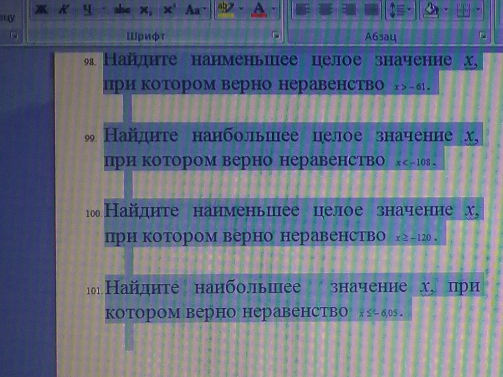 1) Найдите наименьшее целое значение x,при котором верно неравенство x > -61.