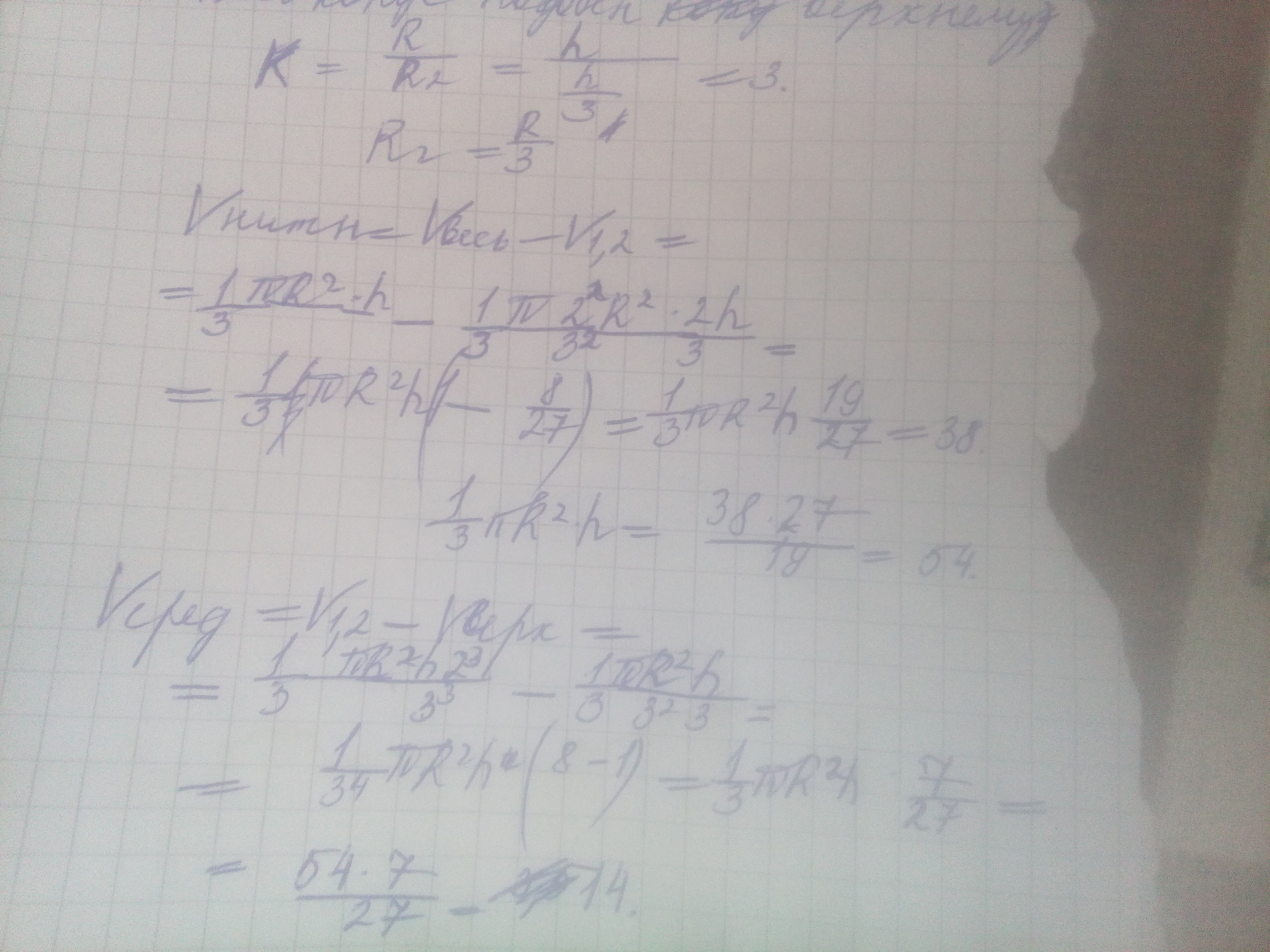 В конусе проведено два сечения плоскостями, параллельными основанию конуса. Высота конуса делится на три равных отрезка. Найти объем средней части конуса, если объем нижней равен 38.