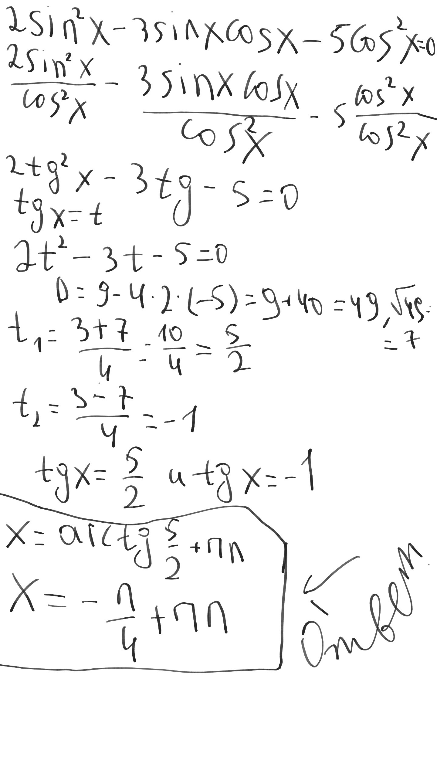Это метод решения, если интересно, называется приведение к однородному уравнению(когда нужно почленно разделить на какое-либо выражение). В этом случае нужно разделить каждый член уравнения на cos^2 (x). Но нужно быть внимательнее, потому что x не должен быть равен pi/2+pi n. Но в этом случае этого корня нет, так что знаменатель не обратится в ноль.