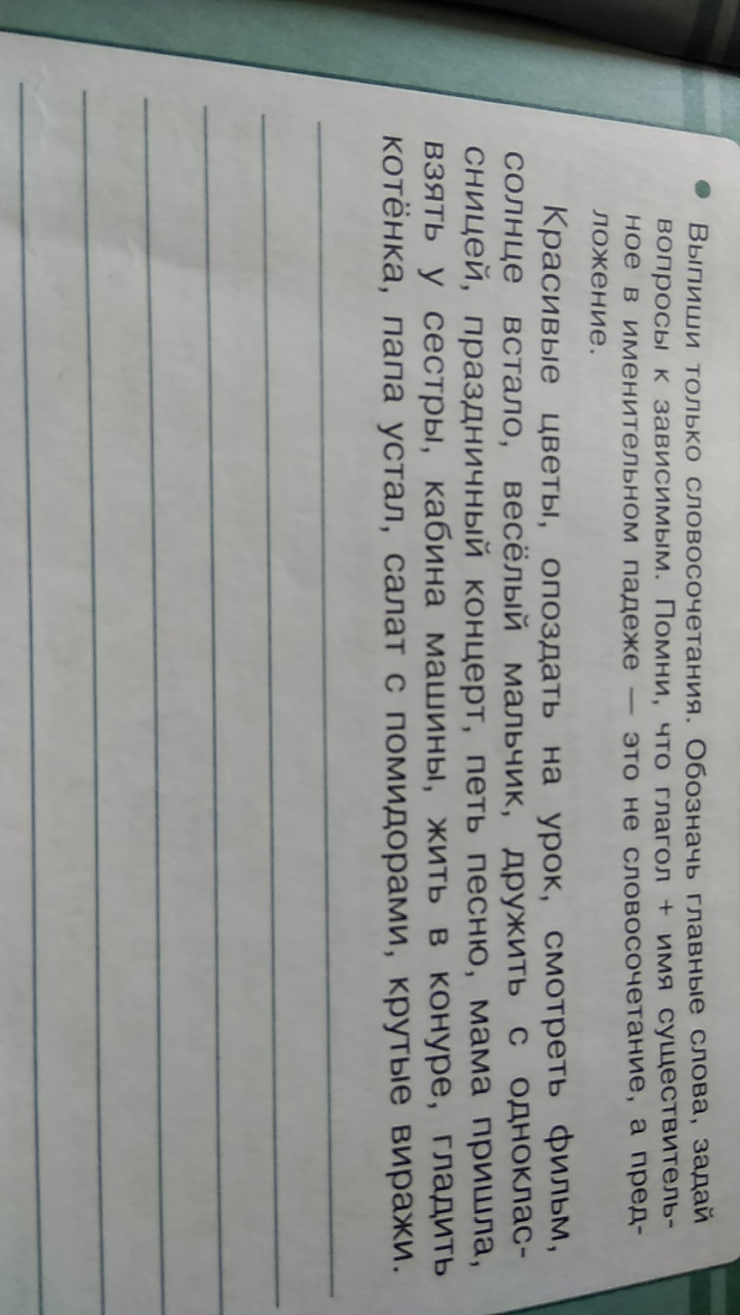 Опоздать на урок,красивые цветы,веселый мальчик,дружить с одноклассницей,праздничный концерт,петь песню,взять у сестры,кабина машины,жить в конуре,гладить котенка,салат с помидорами крутые виражи-все это словосочетания!