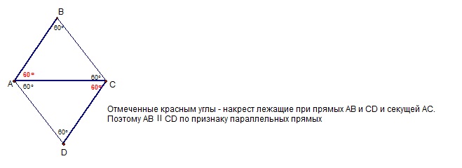Помогите пожалуйста!)Точки b и d лежат в разных полуплоскостях относительно прямой ac, треугольники ABC и ADC-равносторонние. Докажите, что AB||CD. Желательно с рисунком. Только можно решение НЕ через ромб или квадрат, т.к. мы его еще не проходили.