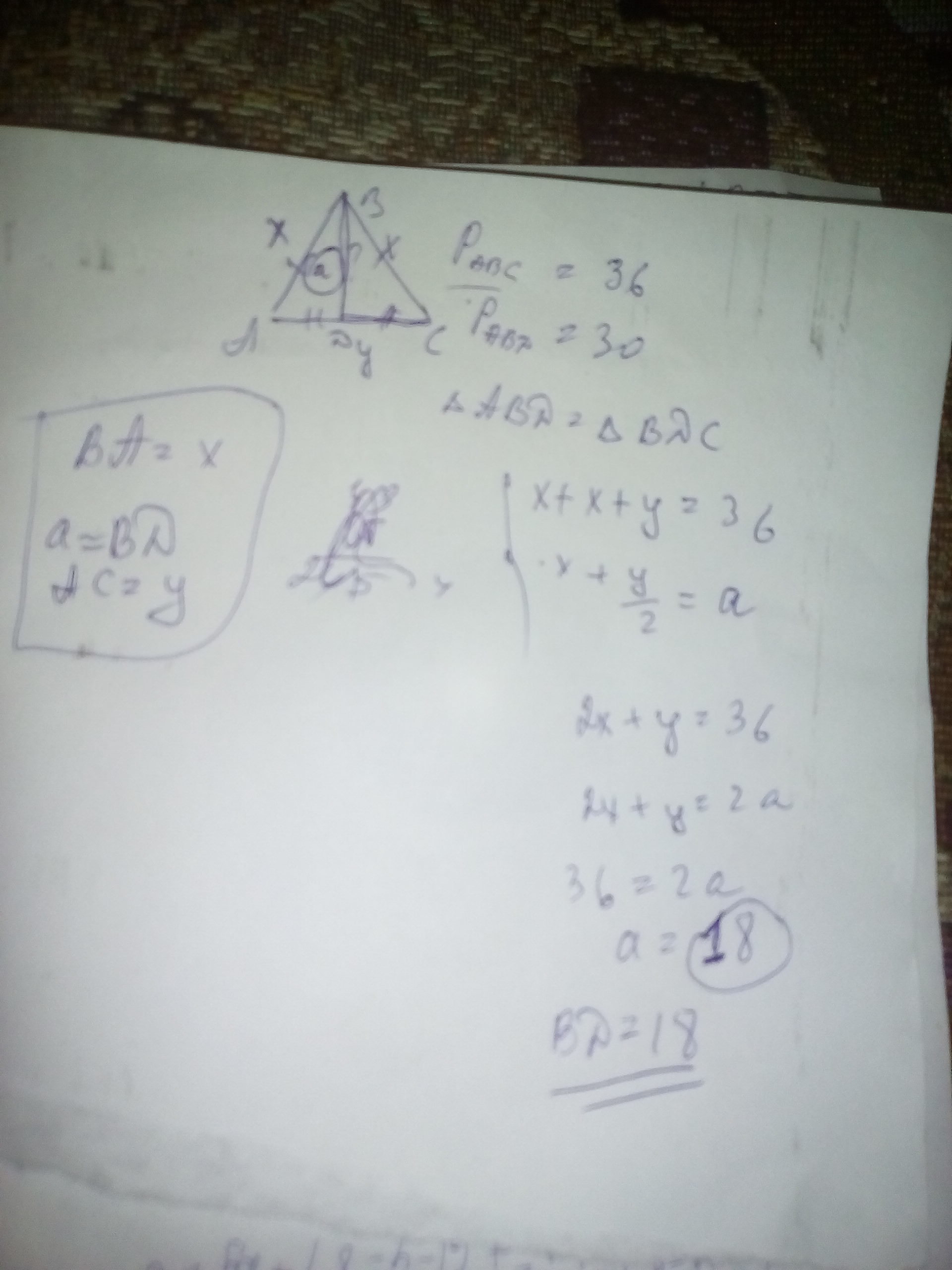 В равнобедренном треугольнике АВС с основанием АС проведена медиана ВД , Периметры треугольников АВС и АВД , соответственно , равны 36 см и 30 см . Найдите длину медианы ВД . Срочно