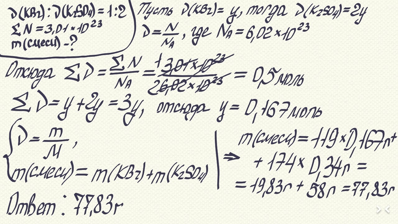Мольное отношение КВr и K2SO4 в смеси равно соответственно 2:1, а общее число атомов в смеси равно 3,01•10^23. Рассчитайте массу смеси.