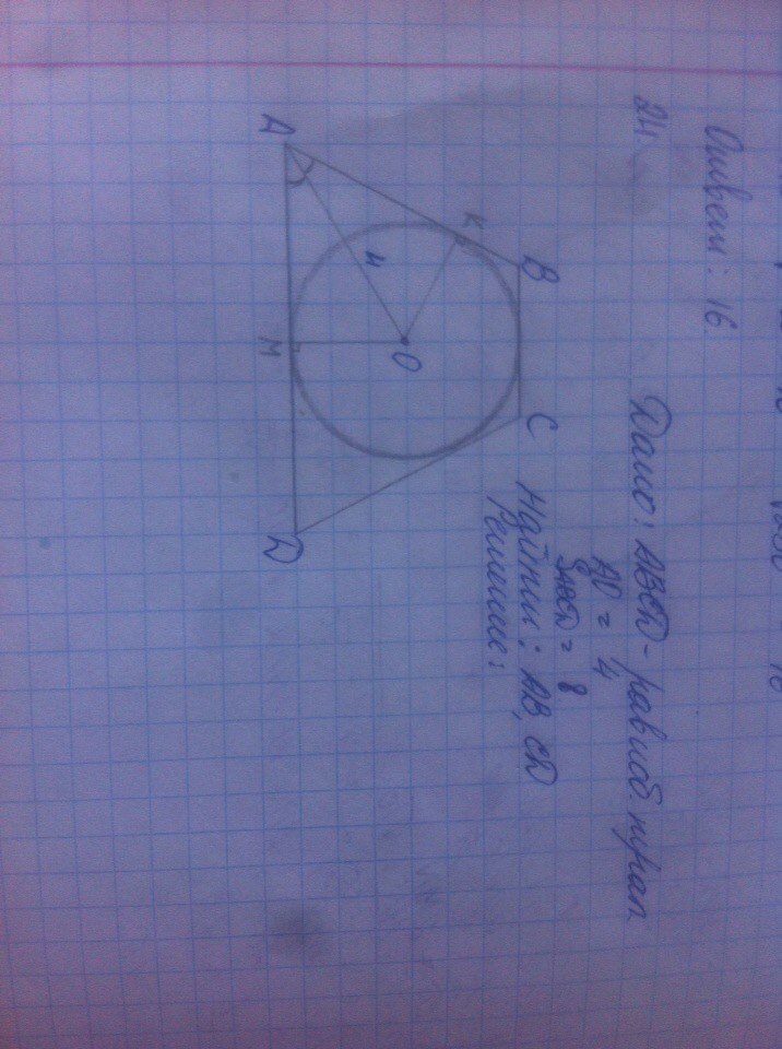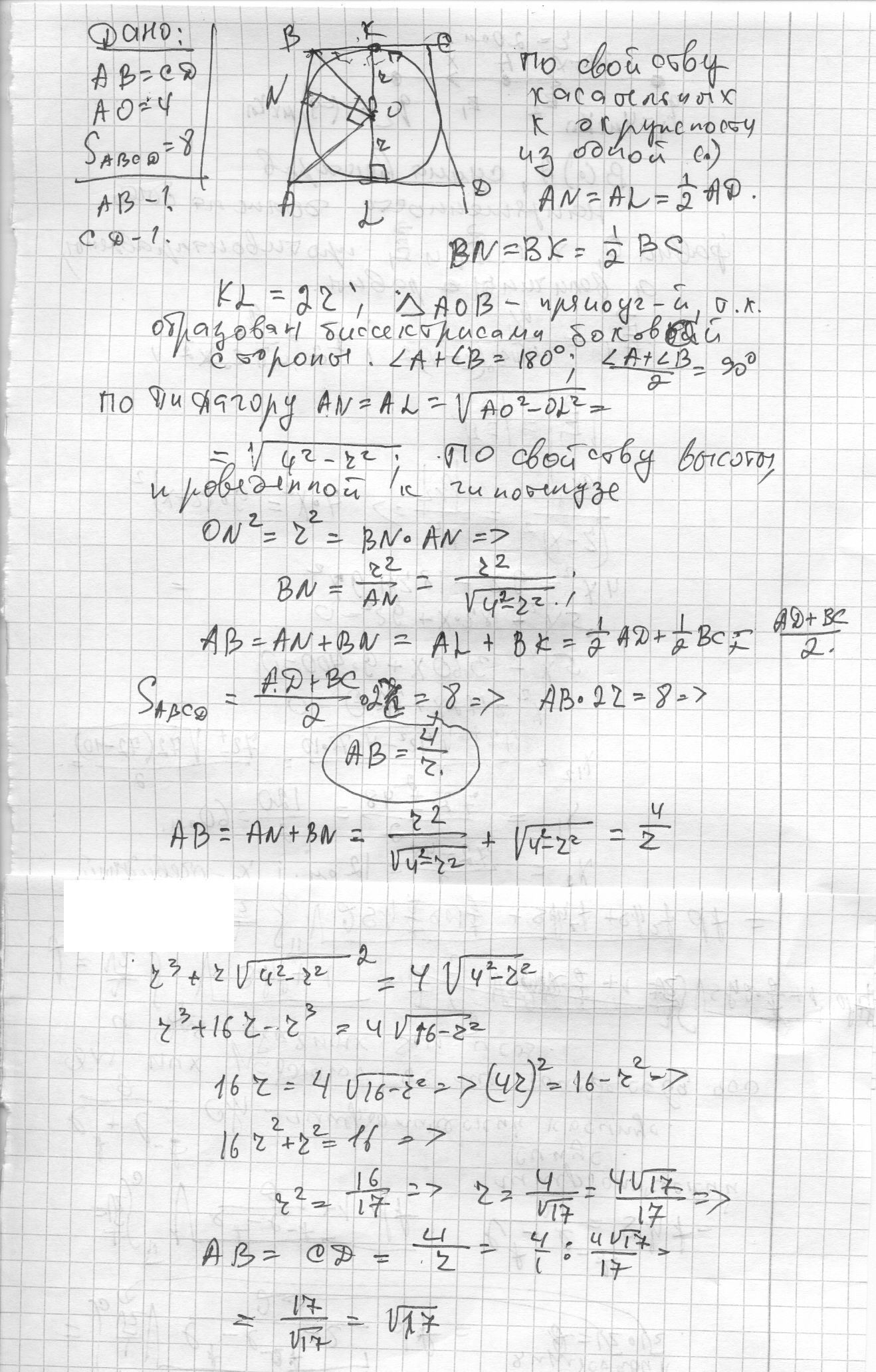 Прилагаю решение данной задачи. Предлагаю запомнить формулу S=2cr, где с-боковая сторона равнобедренной трапеции, в которую вписана окружность. Её можно легко вывести из a+b=c+d, сумма противоположность сторон равна при вписанной окружности.