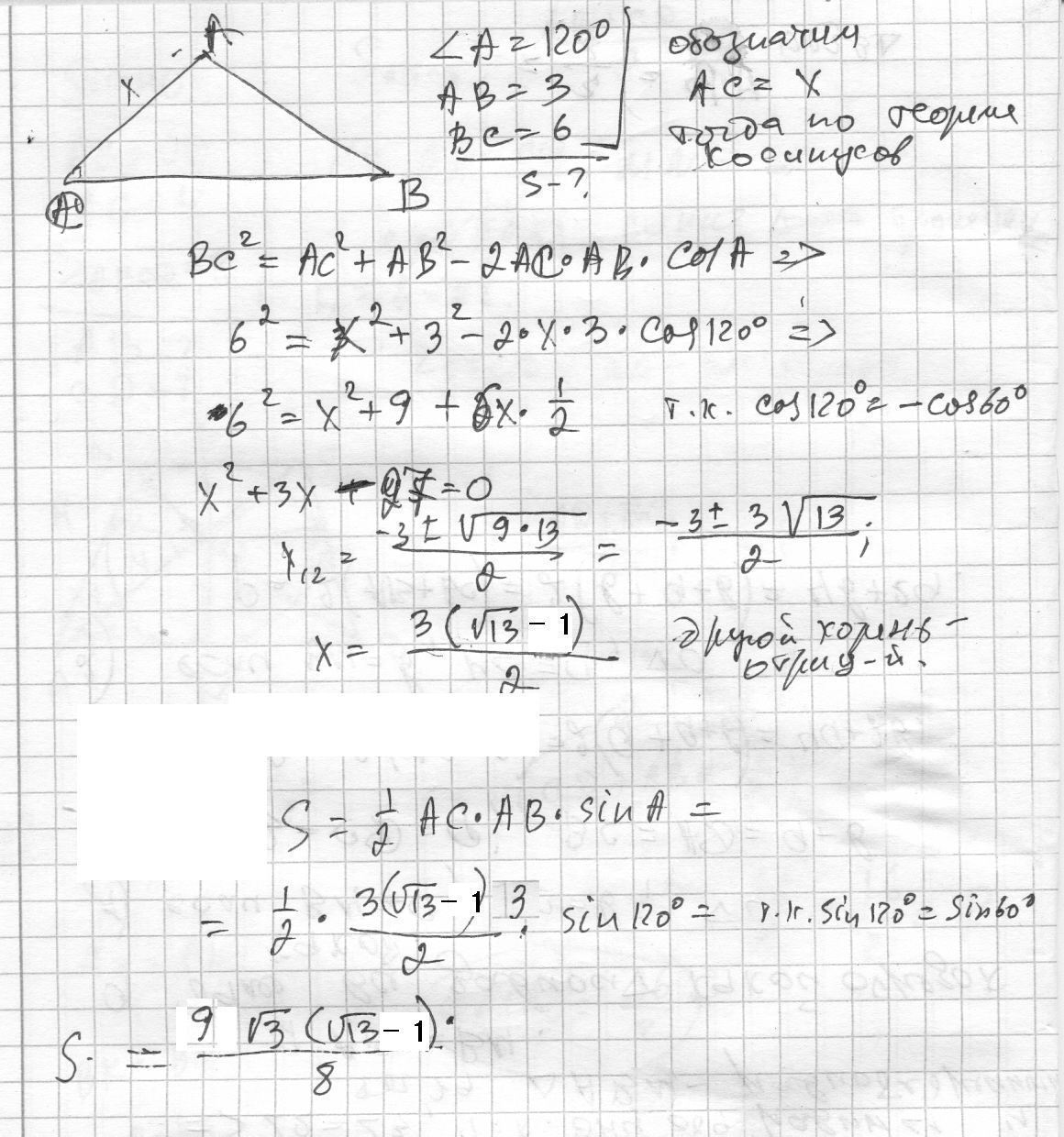 Знайдіть площу трикутника ABC якщо AB=3 BC=6 кут А=120°