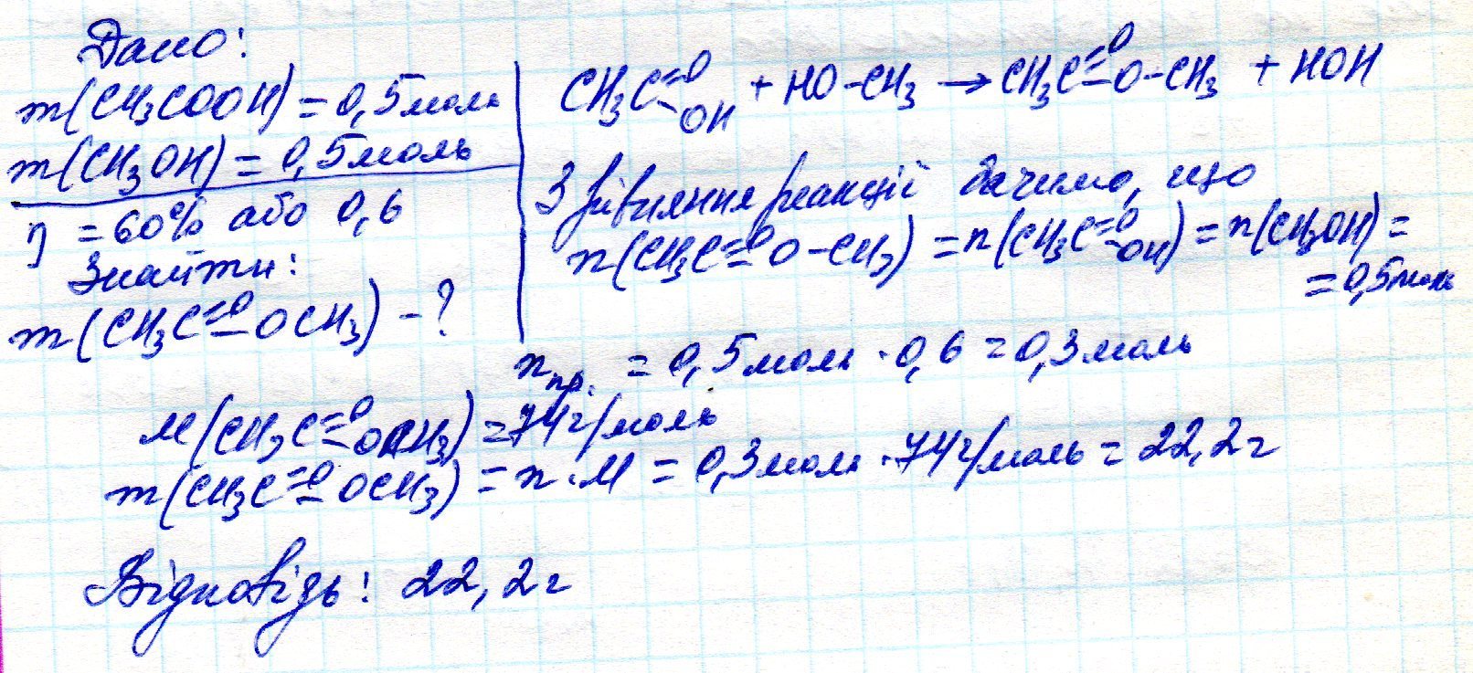 Розрахуйте масу складного ефіру , одержаного в результаті реакції 0,5 моль оцтової кислоти з такою ж кількістю речовини метанолу, якщо масова частка продукту реакції складає 60% від теоретично можливого.
