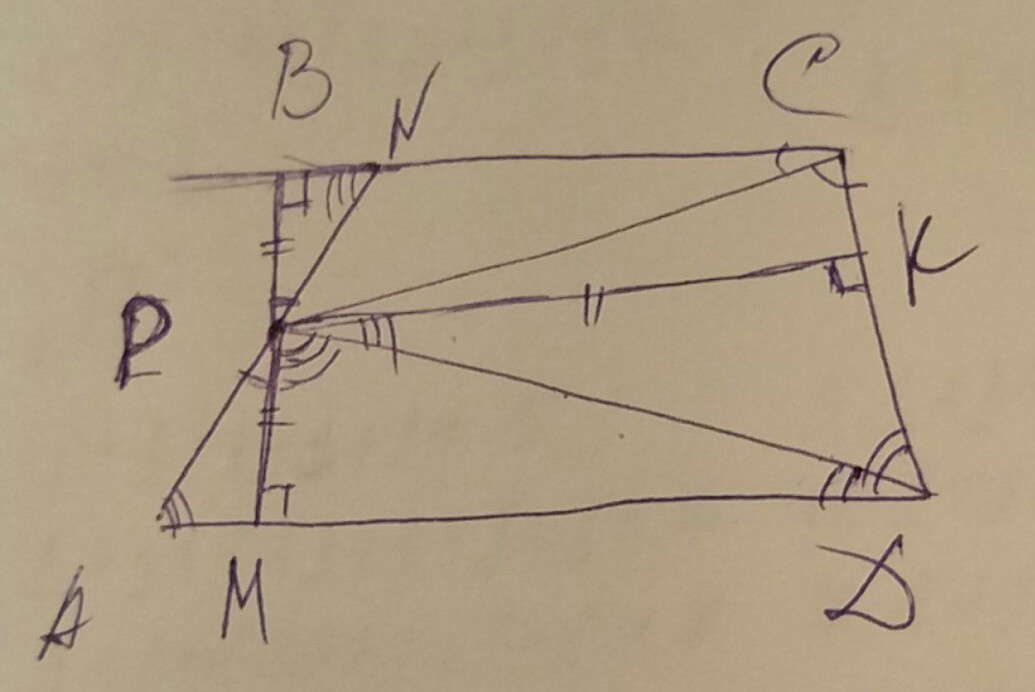 Расстояние от точки до прямой это перпендикуляр, значит PB перпендикулярна ВС, РМ перпендикулярна AD, PK перпендикулярна CD и надо доказать что PB=PM=PK.