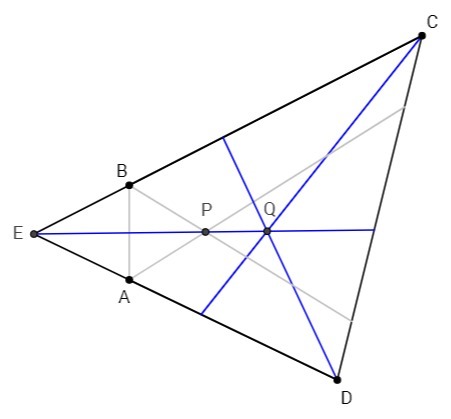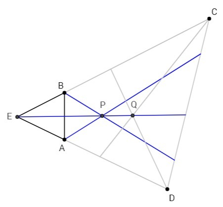 В треугольнике AEB точка пересечения биссектрис внешних углов ABC и DAB - точка P - лежит на биссектрисе угла E.