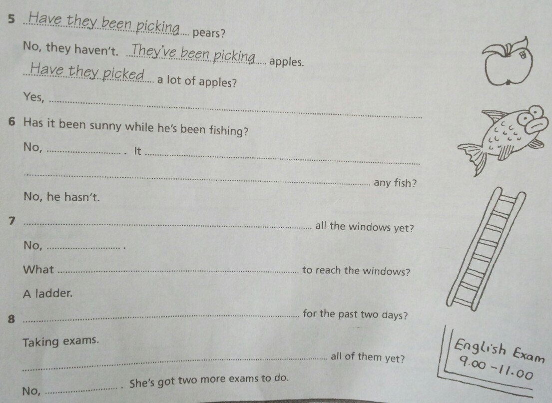 6. No, it hasn't. It hasn't been sunny while he's been fishing. Has he caught any fish?