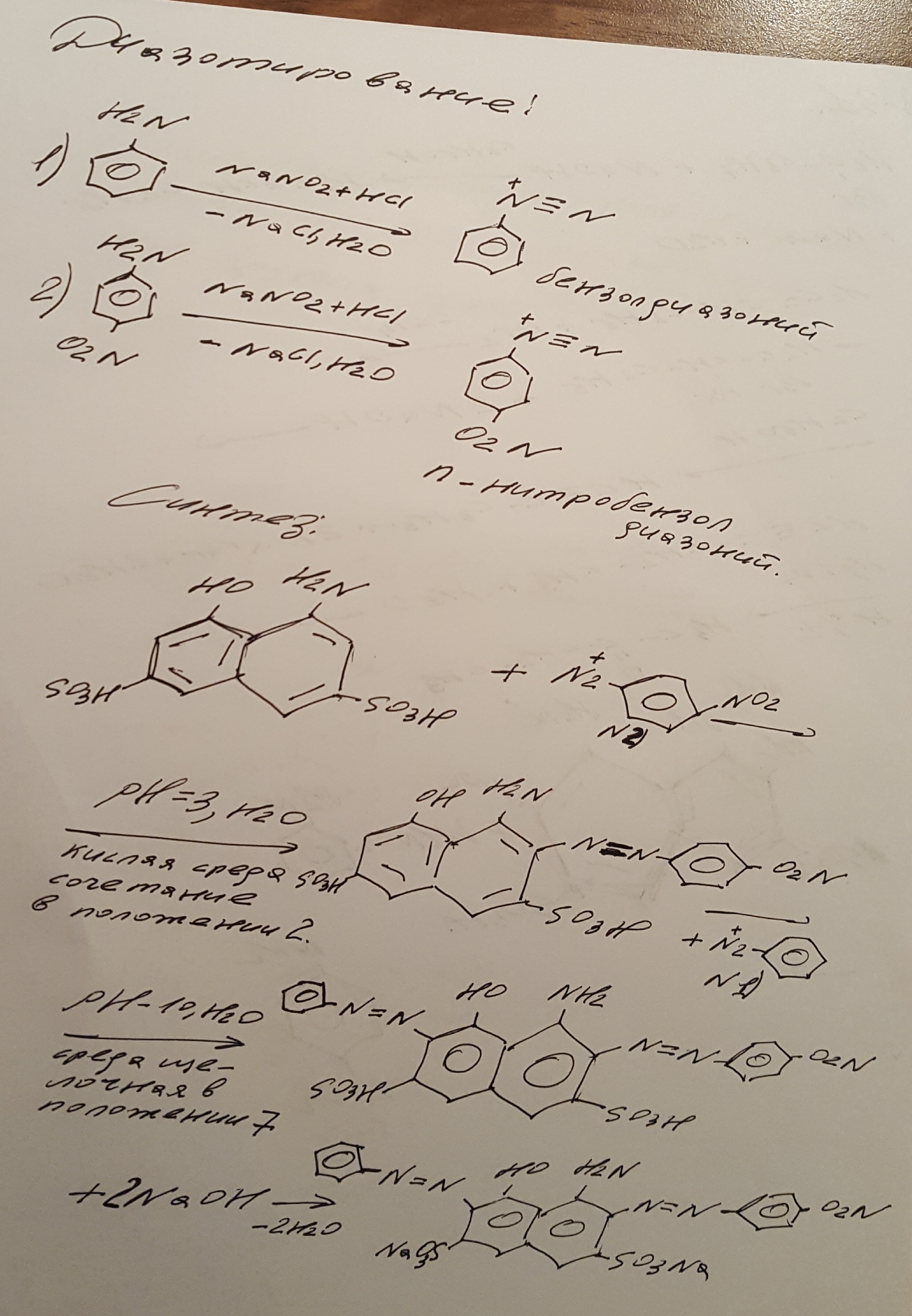 9-267 [ в приложенном файле ] , 9-268. Здесь в кольце одновременно и амино- ,и гидроксигруппа. В зависимости от рН среды сочетание будет проводится при активирующем влиянии либо амино-, либо гидроксигруппы. В таких случаях первоначально сочетание идет в слабокислой среде, где ориентацию оказывает аминогруппа,потом в щелочной и идет атака уже к гидроксо группе. В файле.