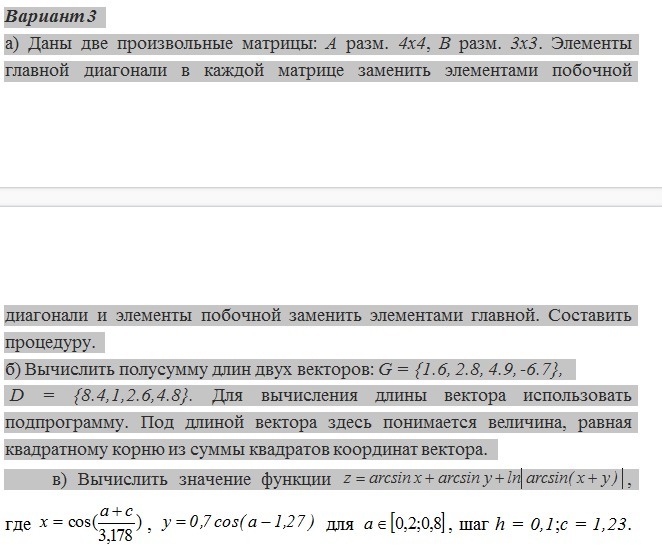 а) Даны две произвольные матрицы: А разм. 4х4, В разм. 3х3. Элементы главной диагонали в каждой матрице заменить элементами побочной