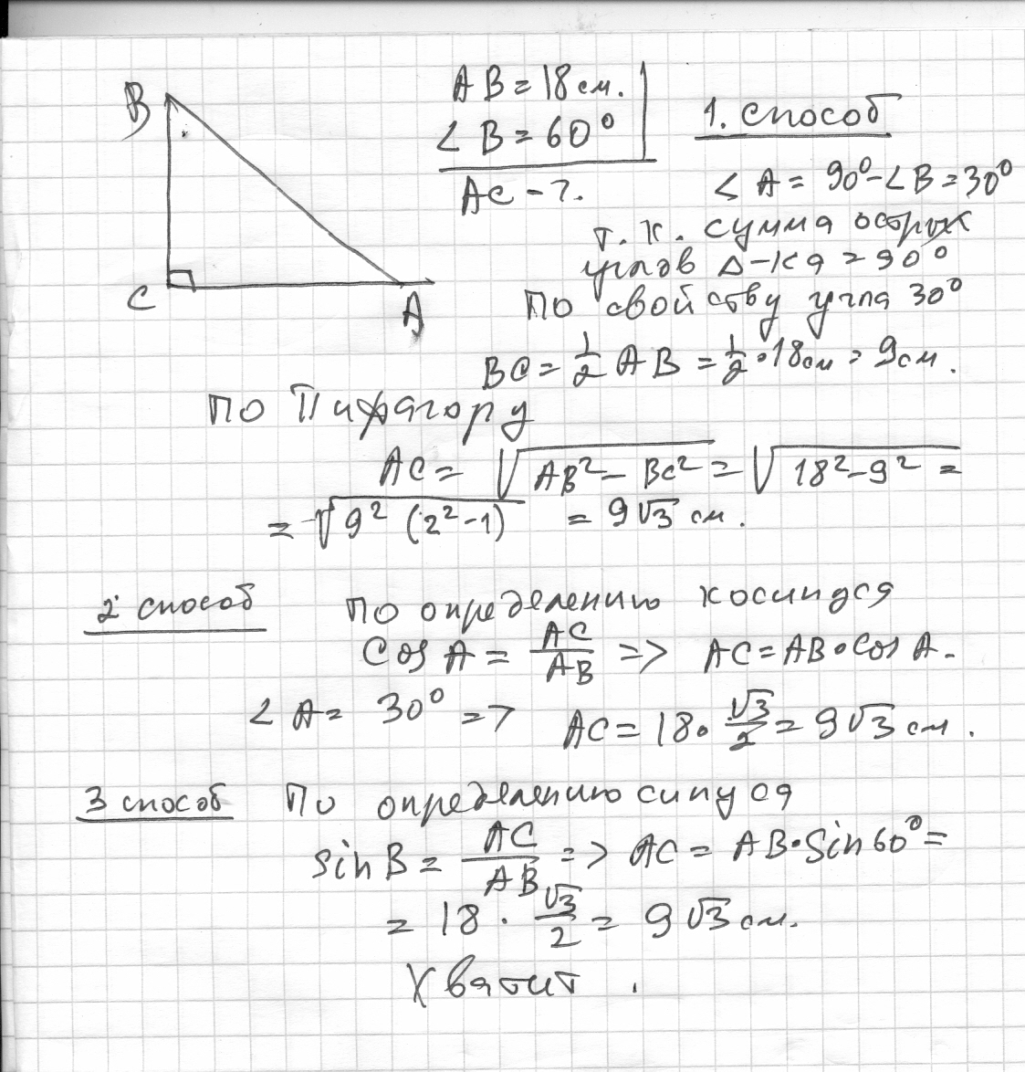 В прямоугольном треугольнике гипотенуза равна 18 м, а угол при вершине B равен 60°. найдите длину катета АС.