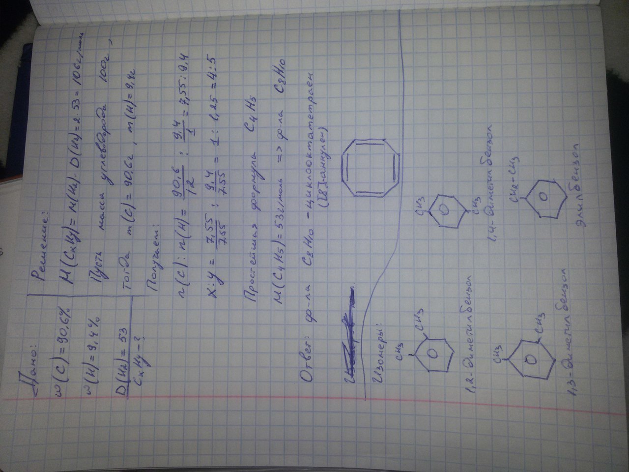 Определите молекулярную формулу органического вещества, если известно, что массовая доля углерода составляет 90,6%, а массовая доля водорода 9,4%. Относительная плотность этого вещества по водороду составляет 53.. Напишите структурную формулу вещества и его изомеры. Назовите вещества межмеждународной номенклатуре.