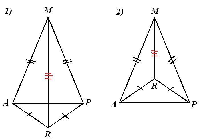 Поскольку в условии не описано точное положение вершин М и R равнобедренных треугольников АМР и ARP относительно их общего основания АР, то и рассматривать надо два случая, представленные двумя чертежами 1) и 2). Но решение в обоих случаях одинаковое.