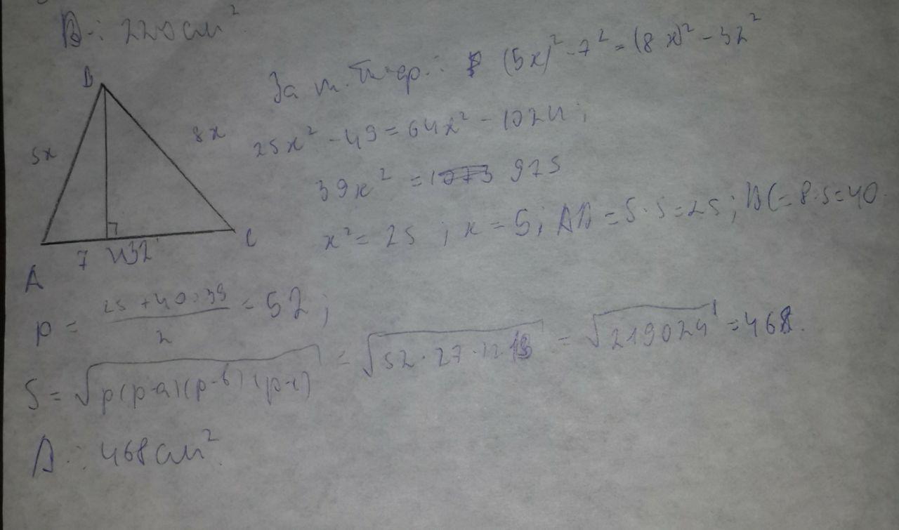 Дві сторони трикутника відносяться як 5:8 , а висота, опущена на третю сторону, ділить її на відрізки 7 см і 32 см. Обчислити площу трикутника