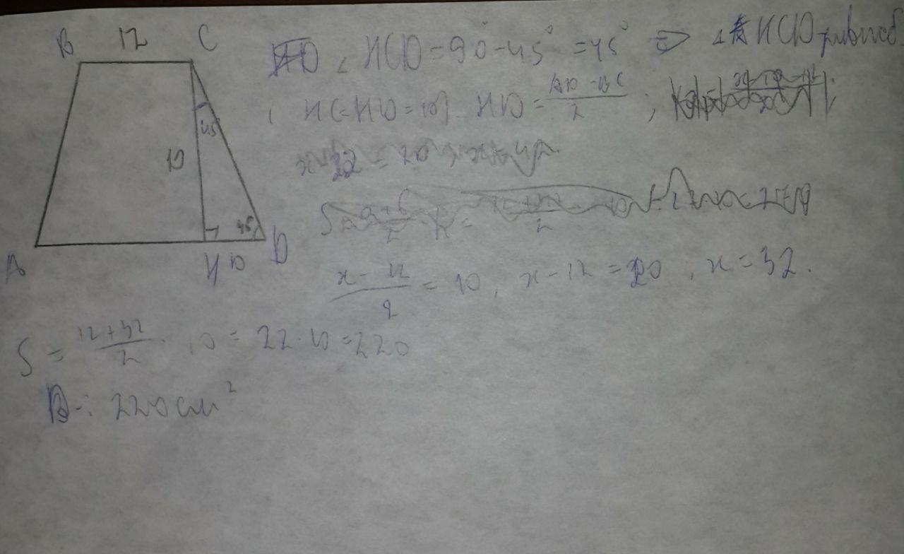 Знайти площу рівнобічної трапеції якщо її Менша основа дорівнює 12 см а висота дорівнює 10 см а бічна сторона утворює з основою кут 45 градусів