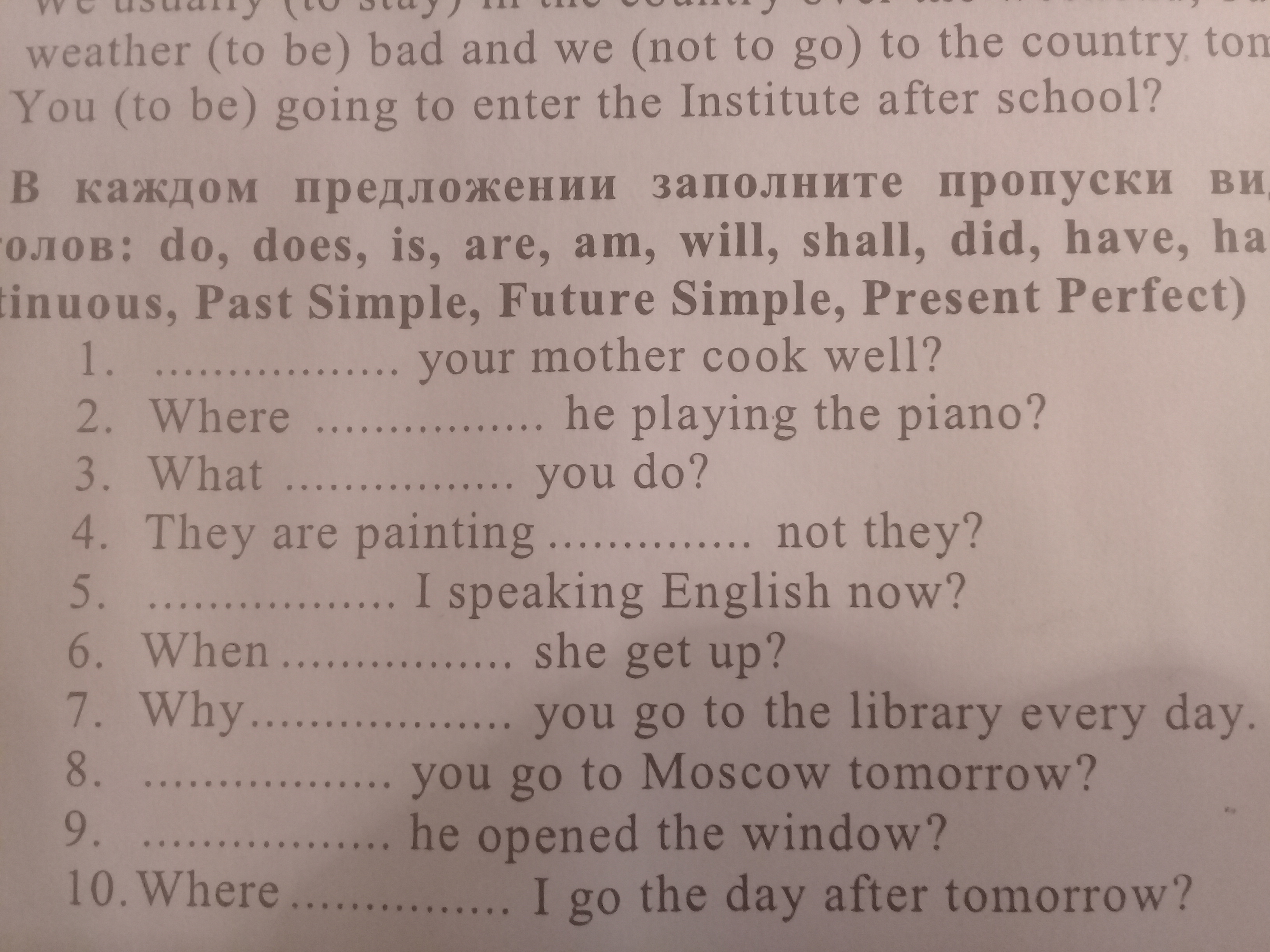 Помогите пожалуйста!!!!!!!!!В каждом предложении заполните пропуски современными формами глаголов: do, does,is,are,am,will,shall,did,have,hsa (Present Simple,Present Continuous, Past Simple, Future Simple, Present Perfect)