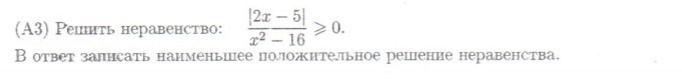 Числитель дроби обращается в 0 при x=5/2, знаменатель - при x=4 и при x=-4. Значит, дробь не определена при x=4 и при x=-4 и обращается в 0 при x=5/2. При x<-4 дробь положительна, при -4<x<5/2 отрицательна, при 5/2<x<4 также отрицательна и при x>4 положительна. Отсюда следует, что наименьшим положительным решением является 5/2=2,5. Ответ: 2,5.