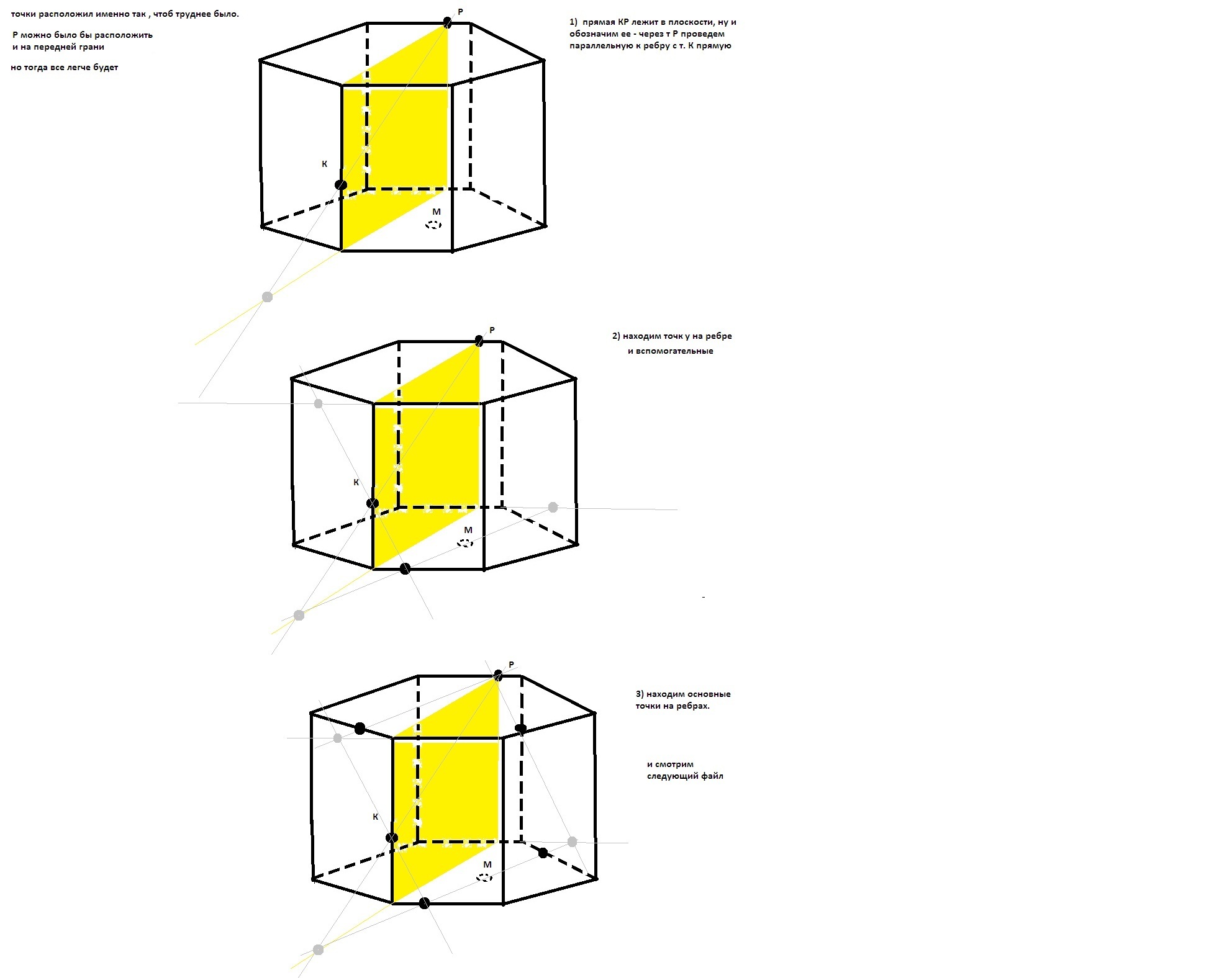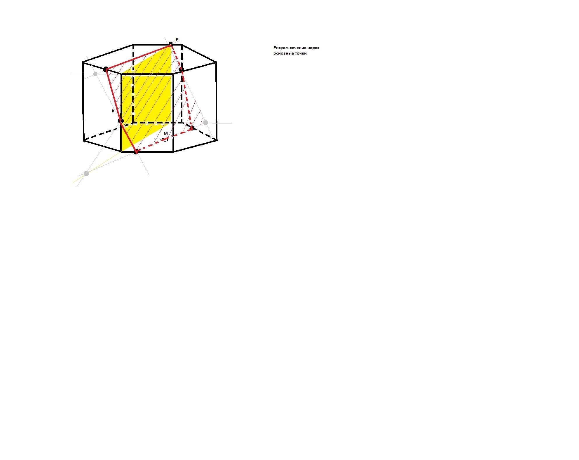 Помогите пожалуйста!!!Дано изображение 6 угольной призмы, построить сечение призмы плоскостью, заданной тремя точками M,K,P методом следов. (т.M находиться в плоскости нижнего основания, K-на боковом ребре, P-на ребре верхнего основания)