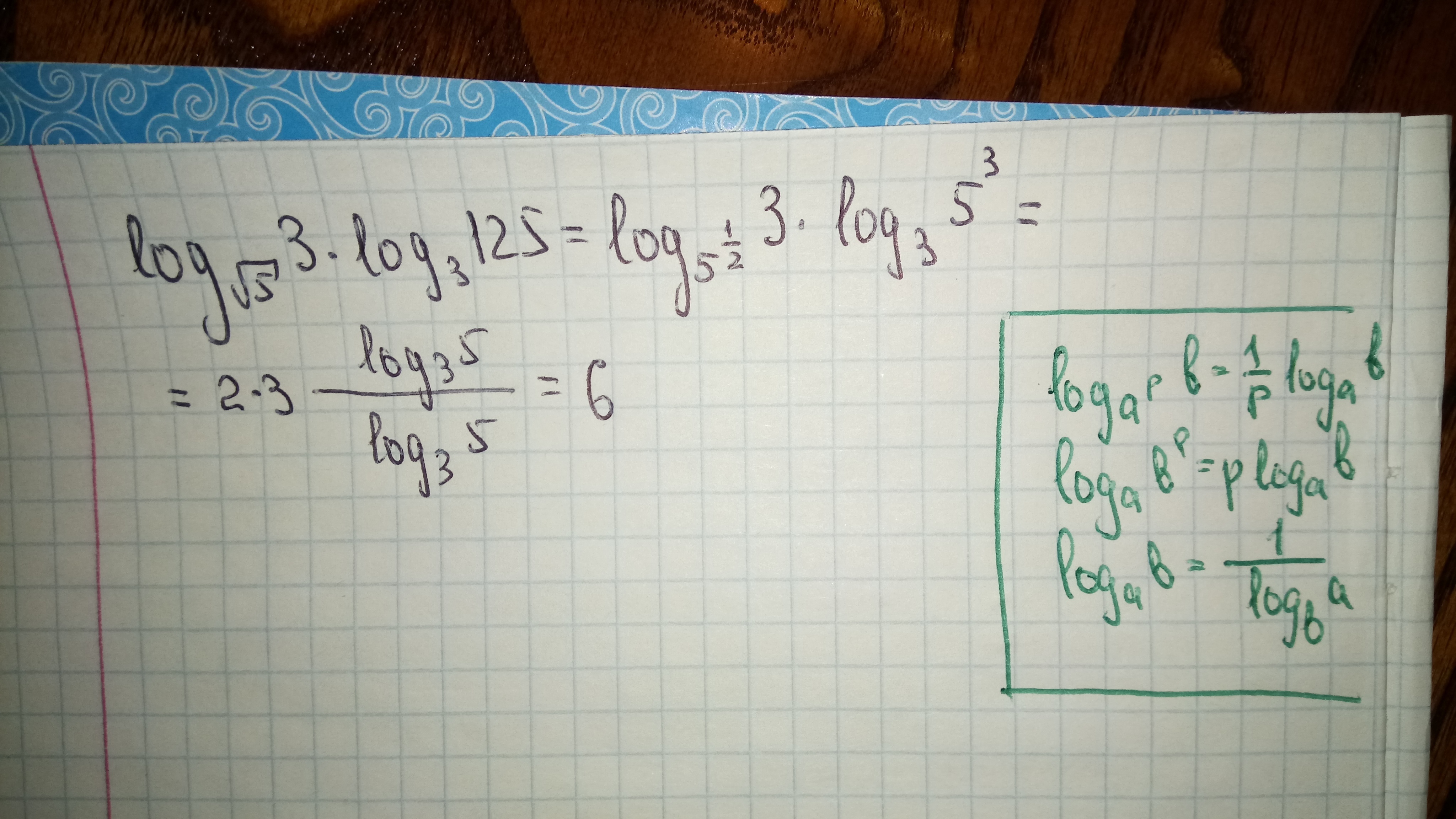 ( 2/log(3) (5) ) * log(3) (125) = 2 * 3log(3) (5)/log (3) (5) = 6
