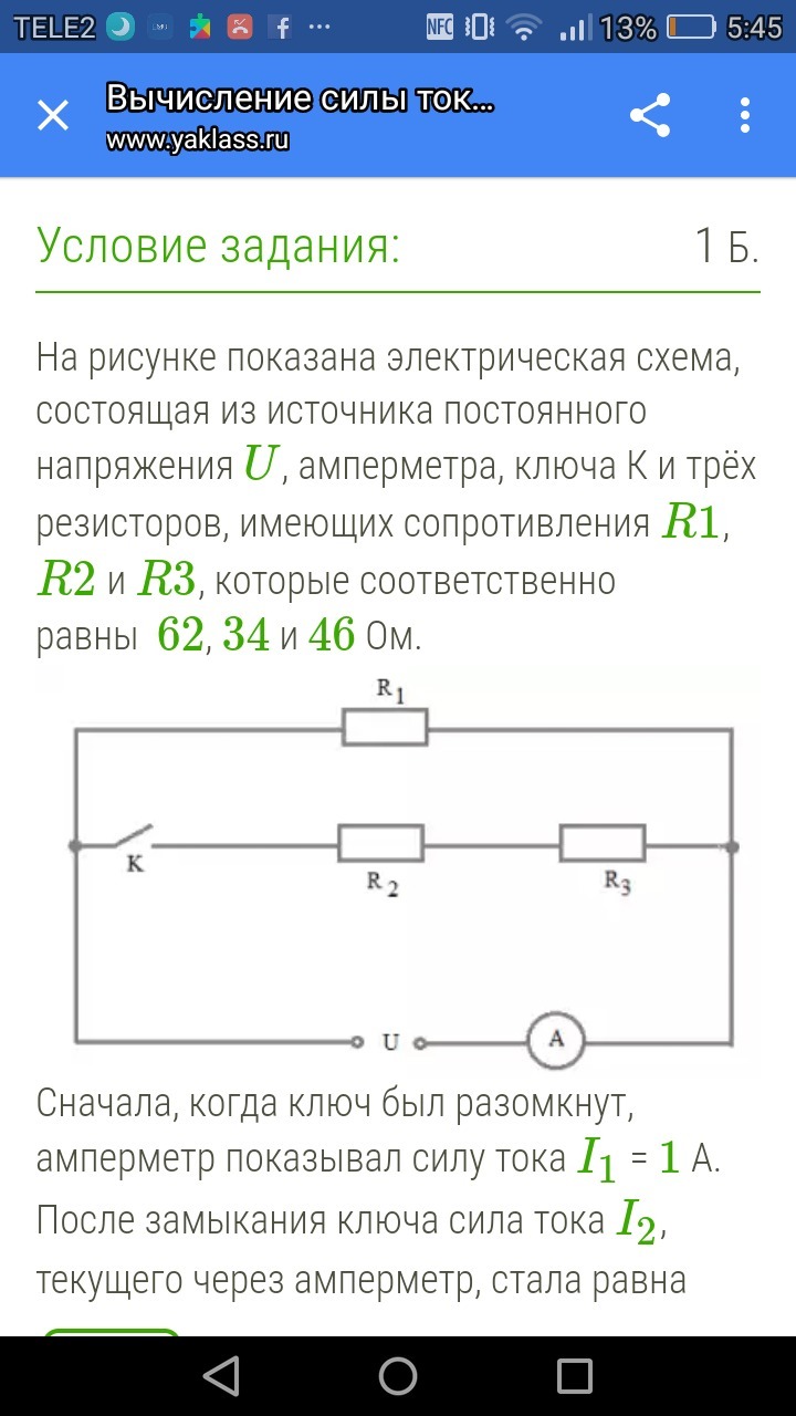 Когда ключ разомкнут, ток пойдёт только через первый резистор. С помощью закона Ома найдём напряжение U: