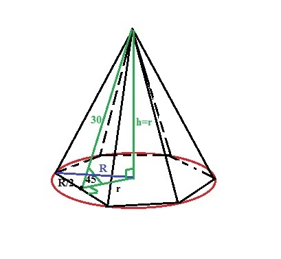 Итак, h=r, тогда по Пифагору 2r²=30², r=√450=15√2см.