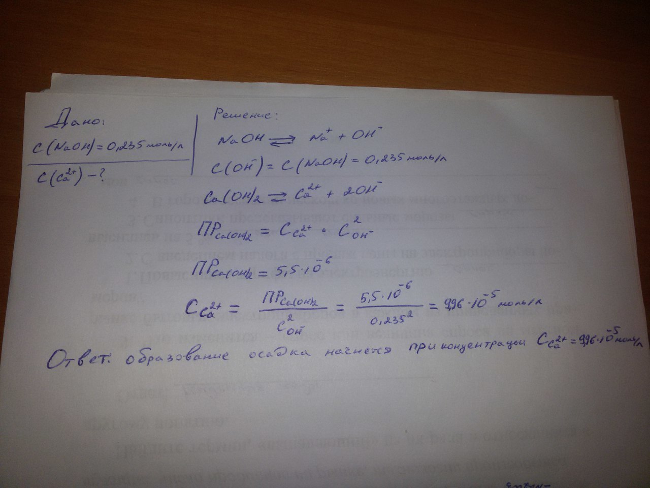 При какой концентрации ионов кальция начнется образование осадка кальций гидроксида из раствора натрий гидроксида с концентрацией 0,235 моль/л?
