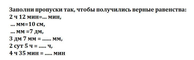 Заполни Пропуски Так,Чтобы Получились Верные Равенства: 2ч 12 мин=... мин, ...мм=10 см, ...=7 дм, 3дм 7 мм = ...... мм, 2 сут 5 ч = ..... ч, 4ч 35 мин = ..... мин