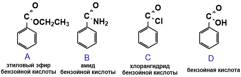 Амид бензойной кислоты < этиловый эфир бензойной кислоты < бензойная кислота < хлорангидрид бензойной кислоты