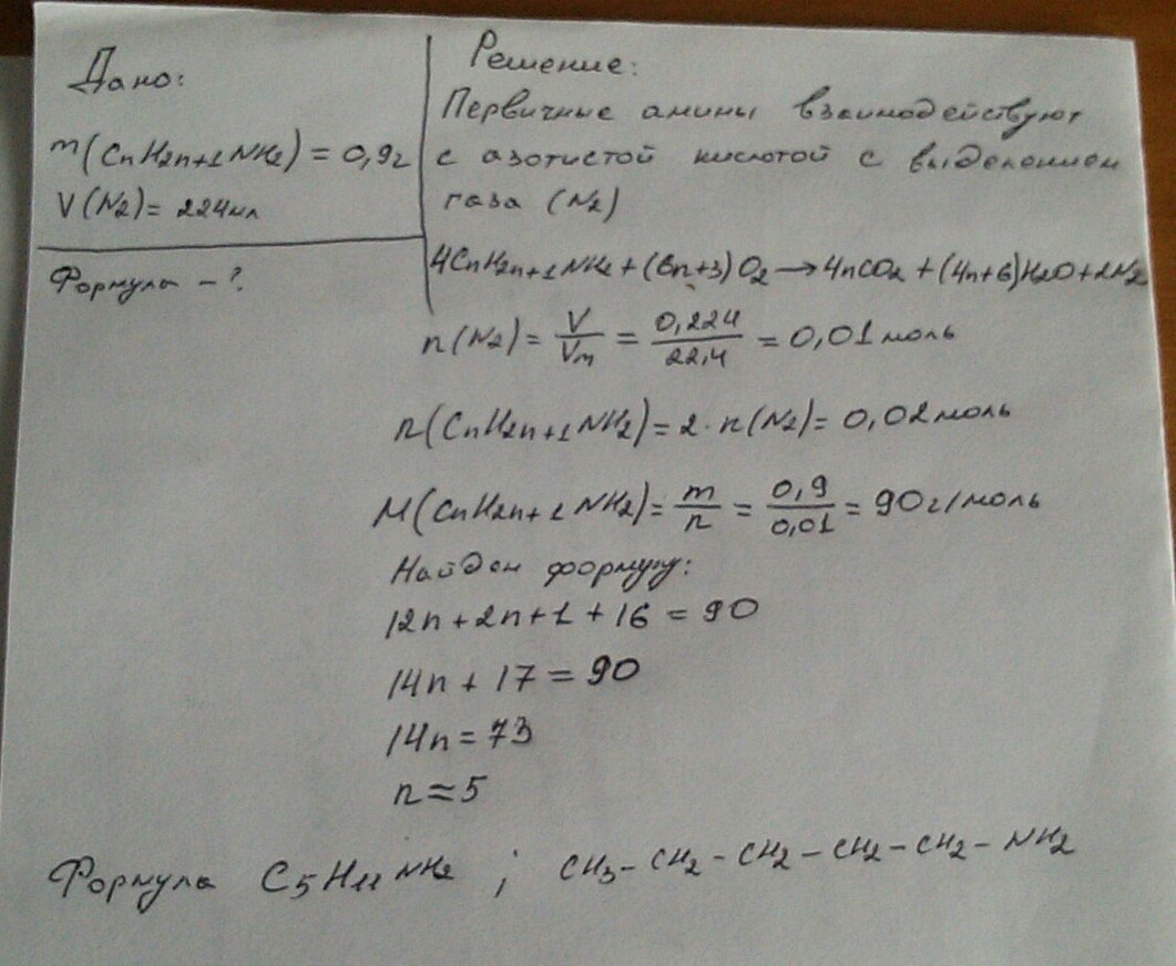 При сгорании 0,9 г некоторого предельного амина выделилось 224 мл азота (н.у.). При взаимодействии этого амина с азотистой кислотой выделяется газ. Определите молекулярную и структурную формулу этого амина.
