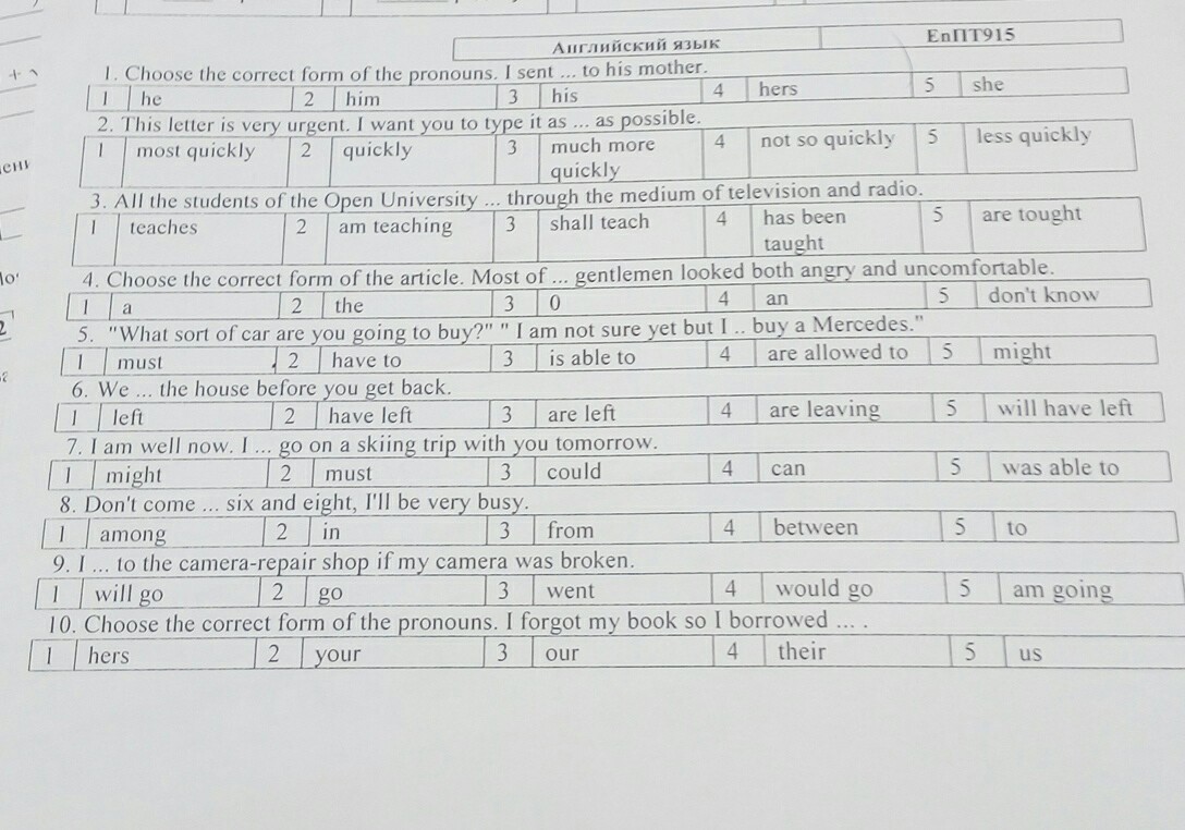 1him 2quickly 3are taught 4the 5might 6will have left 7can 8between 9would go 10hers