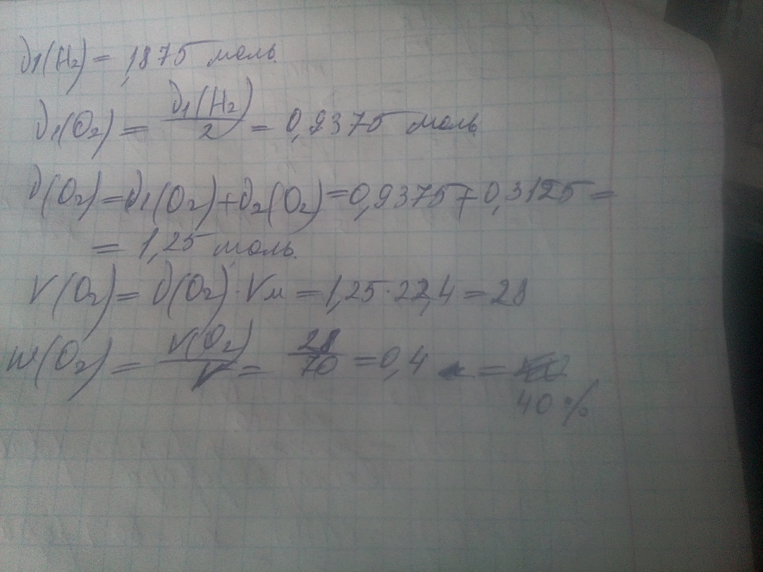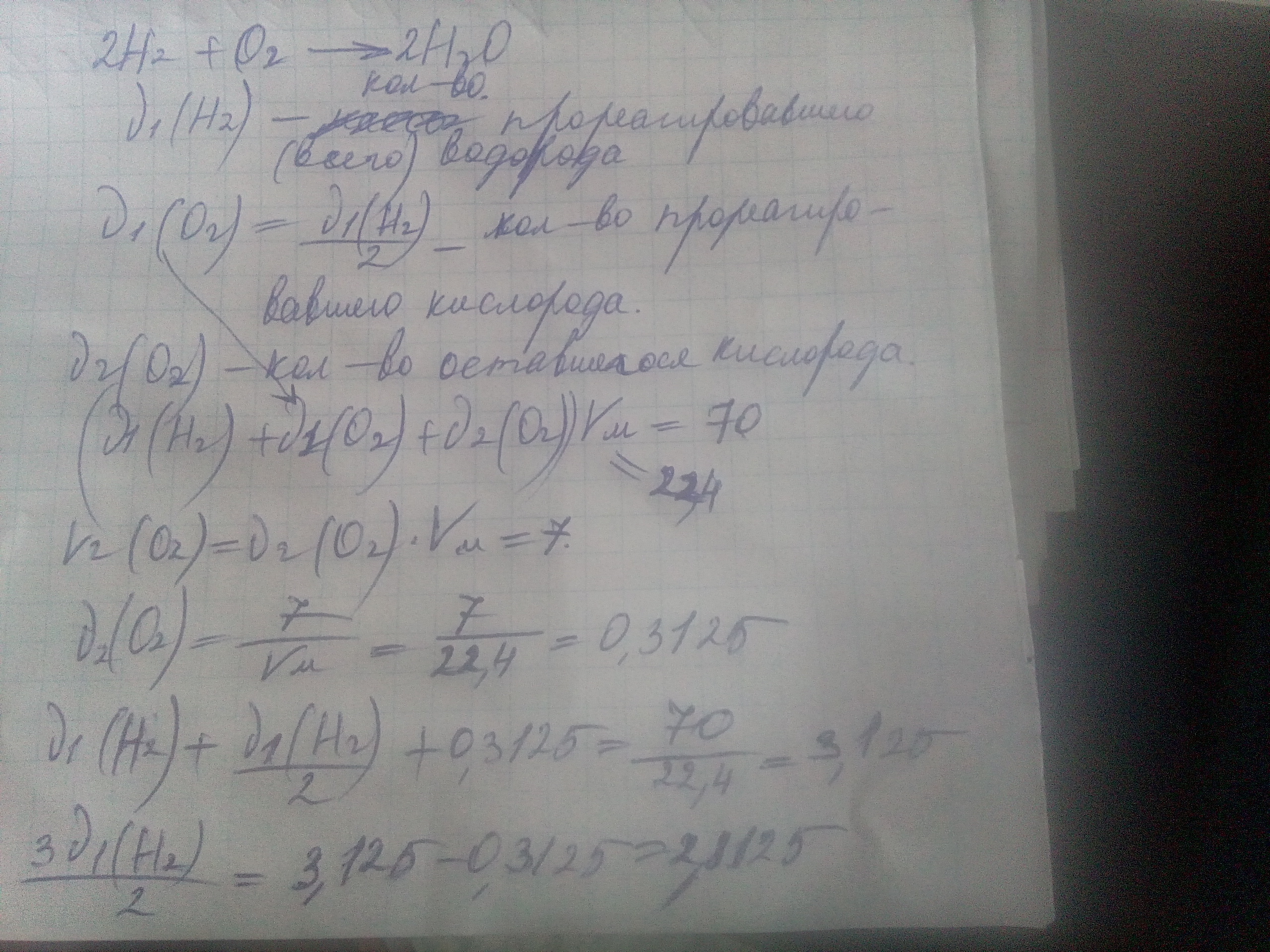 Взорвали 70 л смеси водорода и кислорода, в результате реакции осталось 7 л кислорода. Рассчитать объемную долю кислорода в исходной смеси.