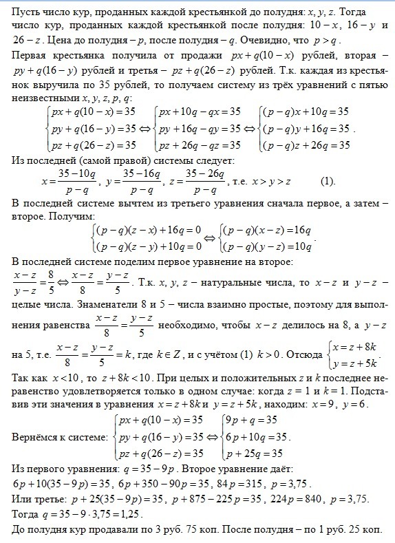 три крестьянки пришли на рынок с цыплятами 1 принесли на продажу 10 цыплята 2 -16 а 3- 26 до полудня они продали несколько Цыплят по одной и той же цене после полудня опасаясь что они все цыплята будут проданы ане понизили цену в результате они продали цыплят с одинаковой выручкой каждая крестьянка получила от продажи 35 руб по какой цене они продавали цыплят До полудня и после полудня?