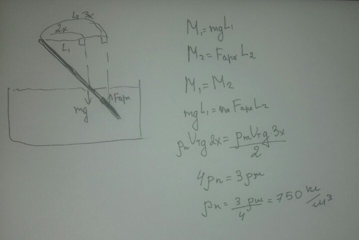 Если возьмем ось за опору палочки, то получится плечо силы mg равняется 2, а плечо силы архимеда 3, так как сила Архимеда приложена к геометрическому центру погруженной части тела, а mg к центру палочки.