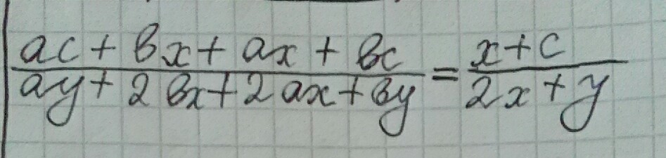(ac+bx+ax+bc)/(ay+2bx+2ax+by)=[c(a+b)+x(a+b)]/[y(a+b)+2x(a+b)]=